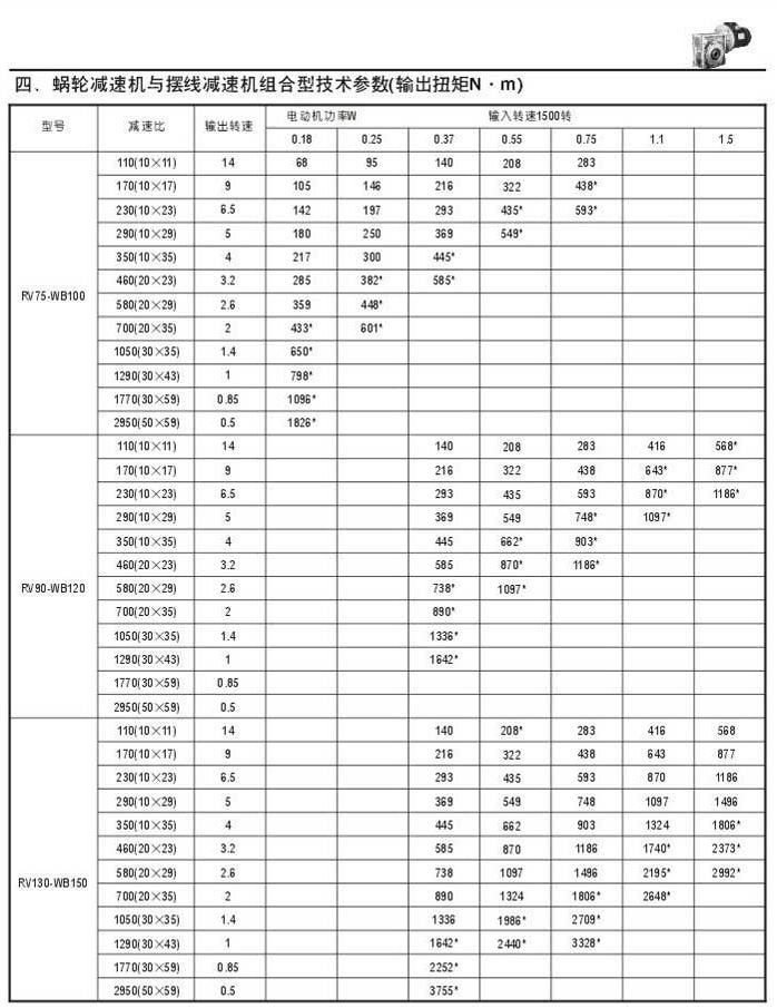 蝸輪減速機(jī)與擺線減速機(jī)組合型技術(shù)參數(shù)表(輸出扭矩N.M)二