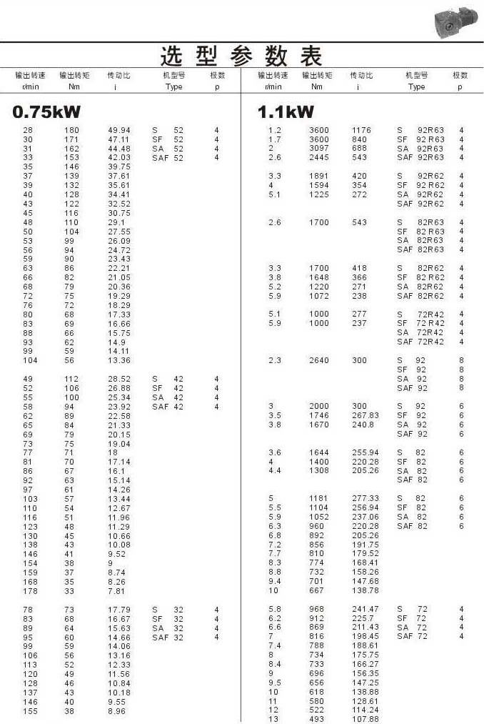 選型參數表0.75kW(續)和1.1kW